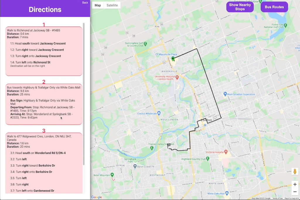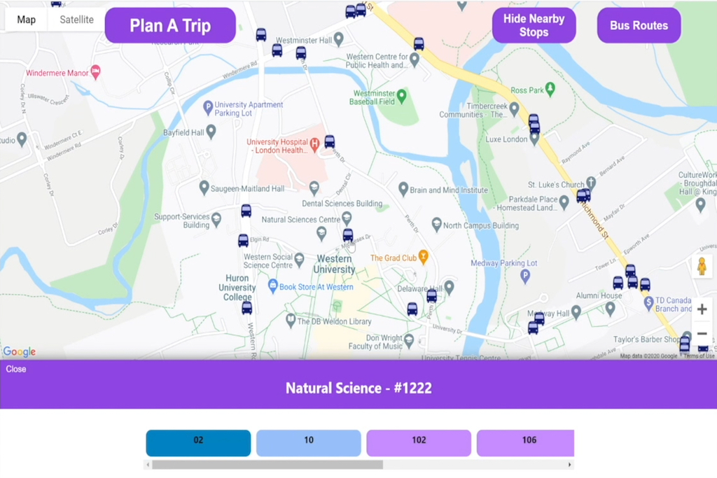 It also caters to users with different levels of expertise in the local transit system. If a user is familiar with London and knows the path of different busses, they can simply press the Show Nearby Stops button to reveal all bus stops near them. For example, the stop clicked in the example below was the Natural Science stop. Since the busses that stop here include Bus Route 02, Bus Route 10, Bus Route 102, Bus Route 106 etc., the user knows that they have those bus route options at that particular stop.