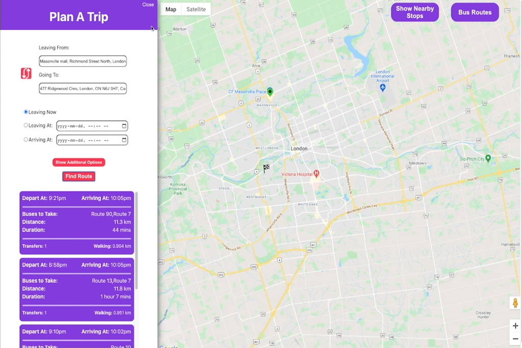 The Plan A Trip interface uses LTC's real-time bus data and a Google Maps API to find the best route options. When the user opens the Plan A Trip tab, they are prompted to enter a source and destination address by typing it out or clicking on the map. They can decide what time they would like to leave or arrive and whether they want to minimize walking or transfers before they click Find Route. Once they do, the user will have different route options, each complete with important information about departure/arrival times, distance, duration, and transfers.